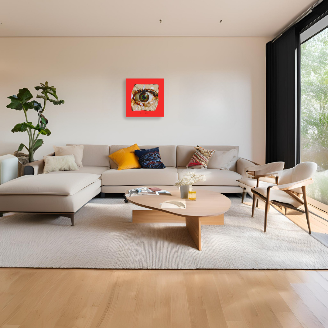 At the center of the work, a torn piece of newspaper, seemingly removed from its context, depicts an eye filled with terror. This eye, with its penetrating and unsettling gaze, symbolizes the fear of change and the unknown. Wrapped around the pupil is an emerald green ouroboros, a serpent biting its own tail, an iconic symbol of eternity and the endless cycle. The contrast between the ouroboros's bright green and the vibrant red of the background creates a visual dynamism that captures attention and invites reflection.