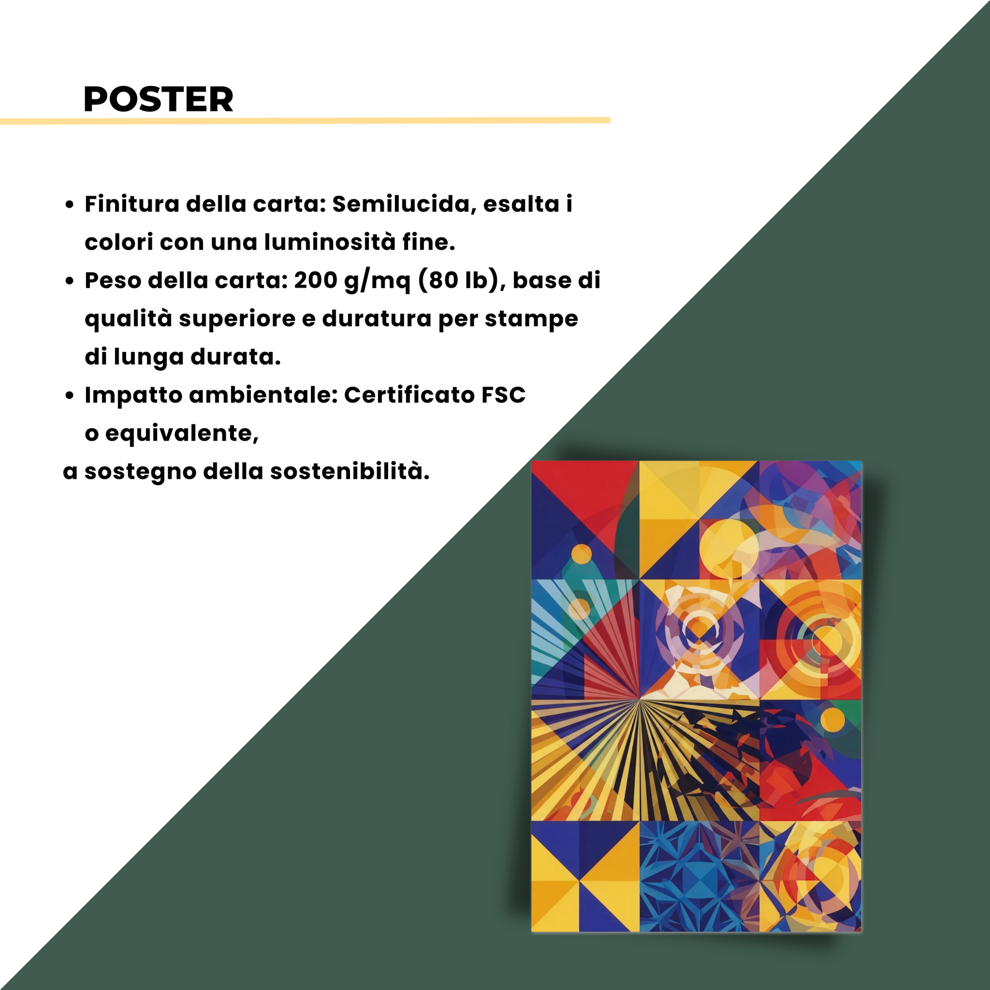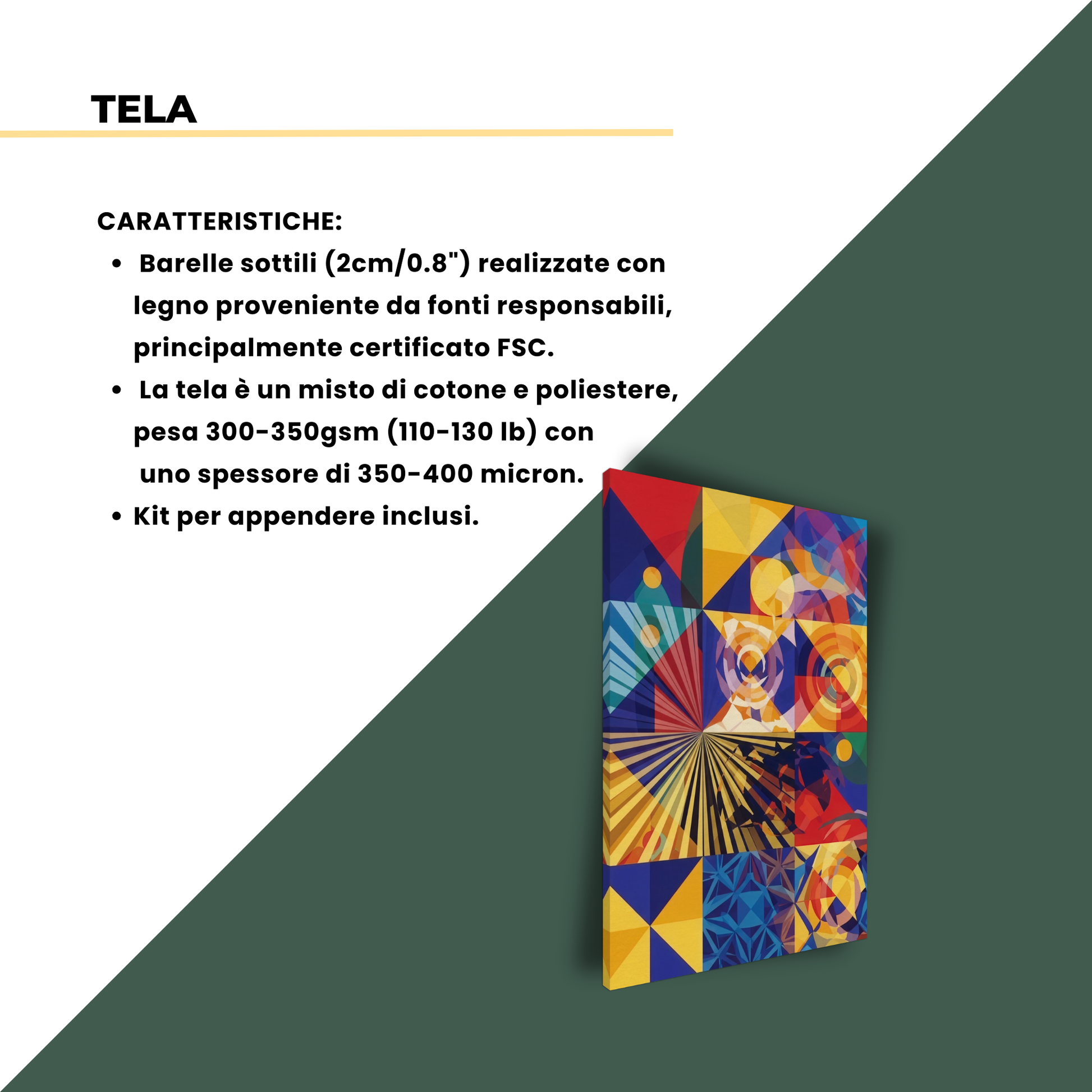 The work features abstract geometric patterns in a vibrant palette of yellow, blue, red, and orange, with layering and transparency effects that make every detail vibrant and unique. The overall effect conveys vitality and modernity, perfect for contemporary spaces and those seeking distinctive design.