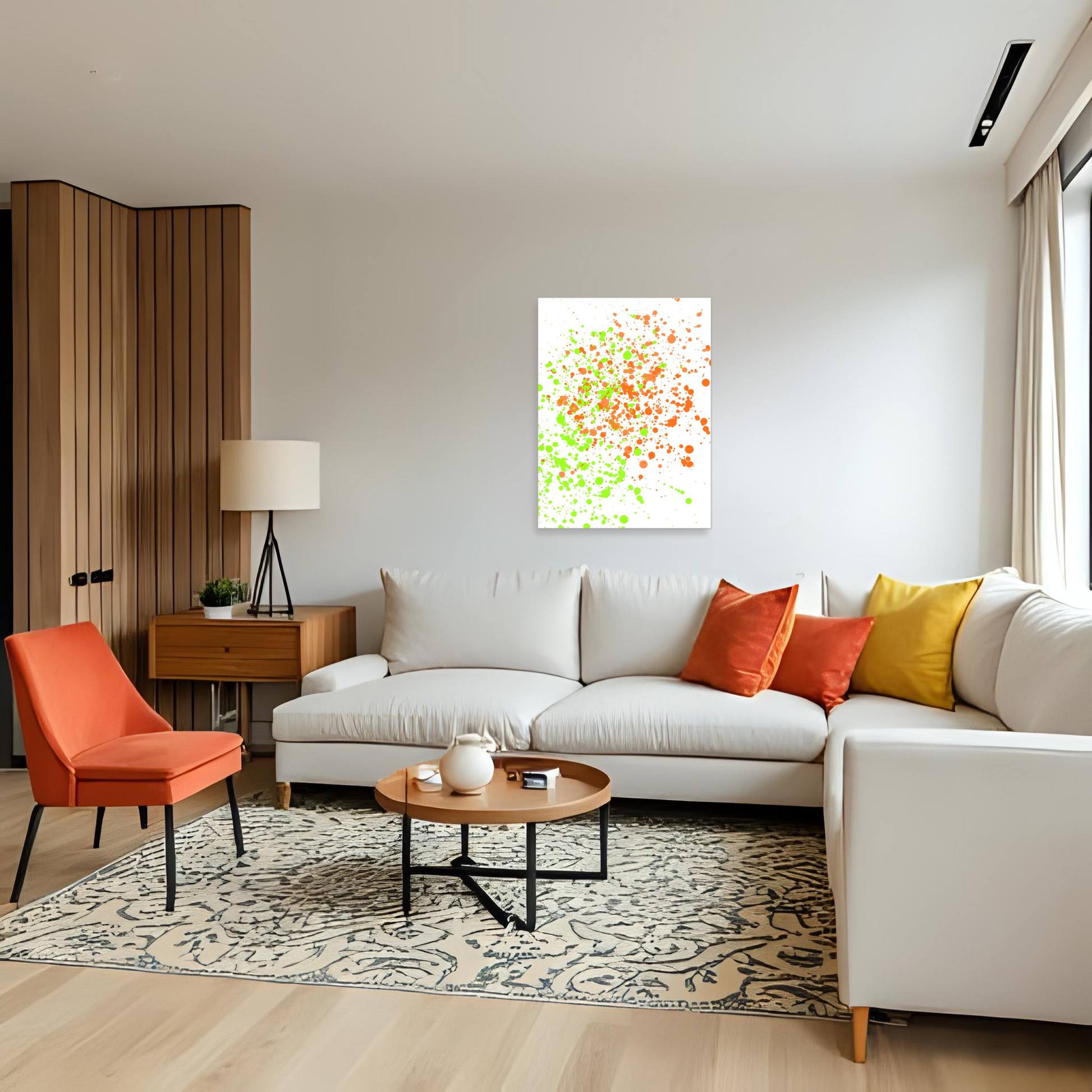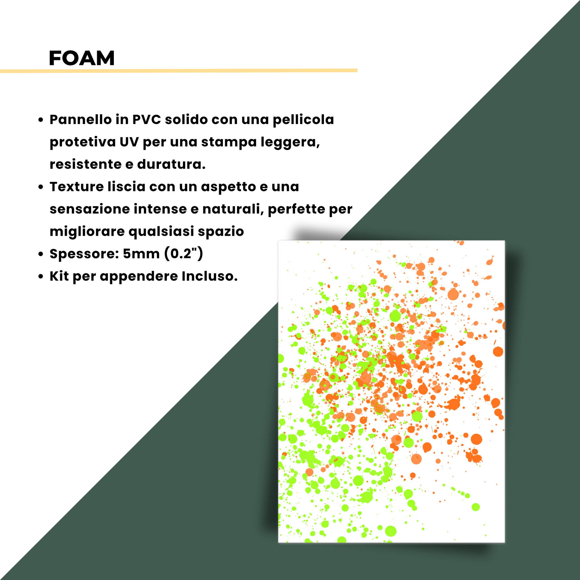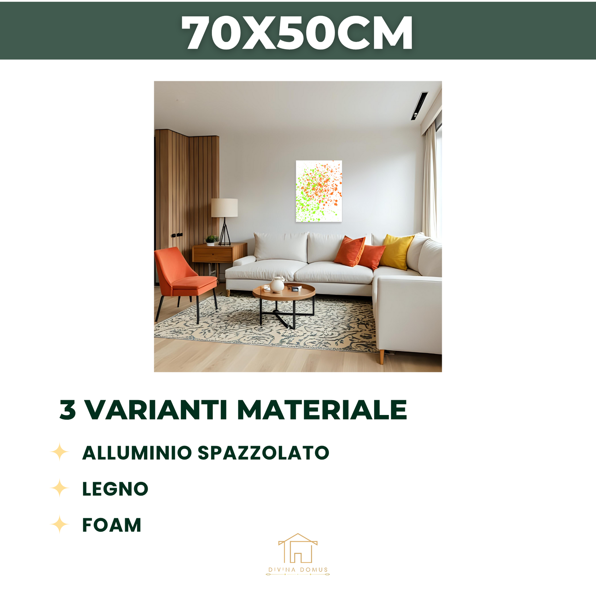 Lasciati travolgere da una tempesta di colore: questa opera trasforma l’ambiente in uno spazio vibrante, grazie agli schizzi di verde lime e arancione, simboli di vitalità e positività. La variante in alluminio spazzolato esalta la luminosità e la modernità del quadro, mentre foam e legno aggiungono rispettivamente leggerezza e calore naturale all’opera. Perfetto per ravvivare salotti, uffici e spazi creativi, questo quadro porta un’ondata di energia visiva che stimola entusiasmo e creatività ogni giorno.