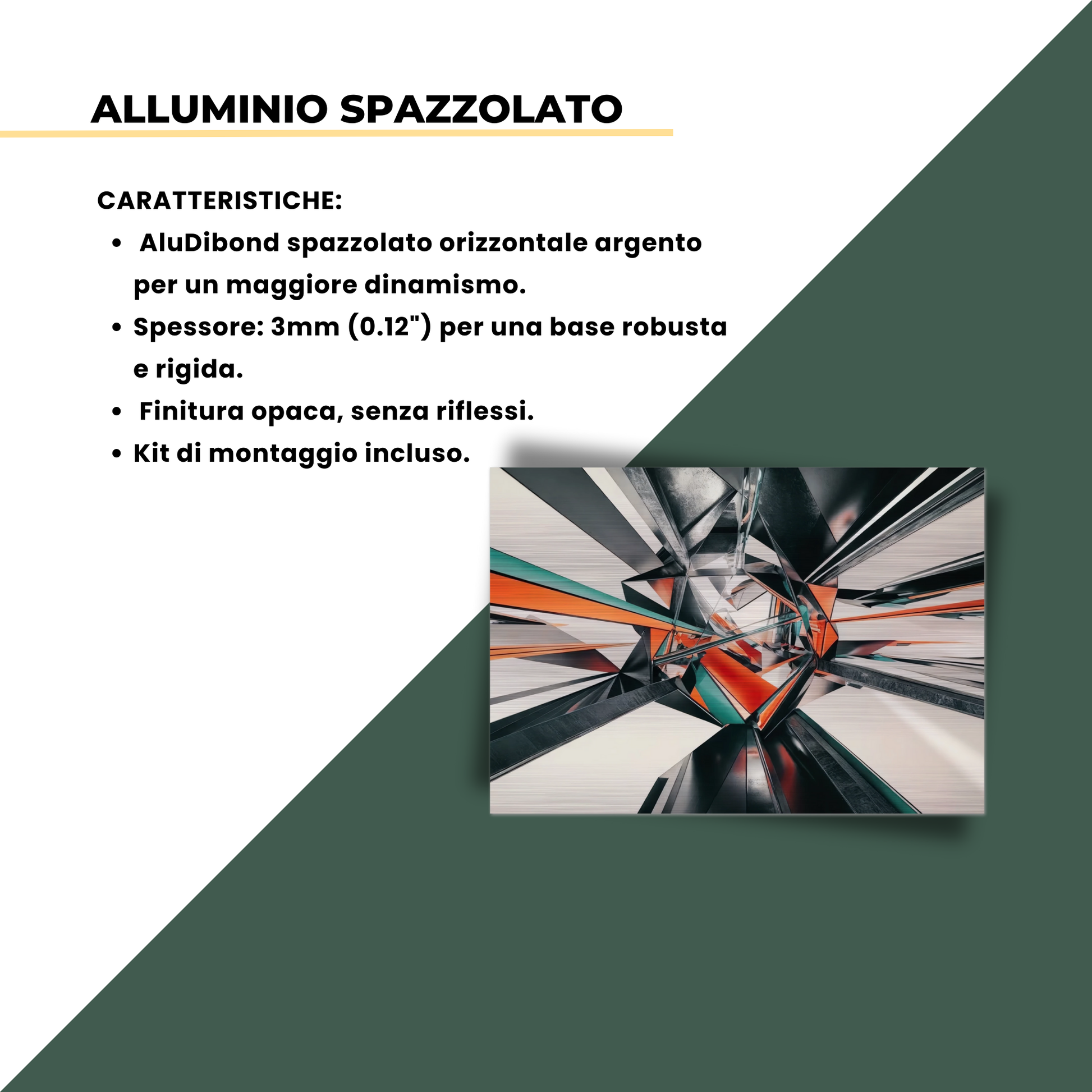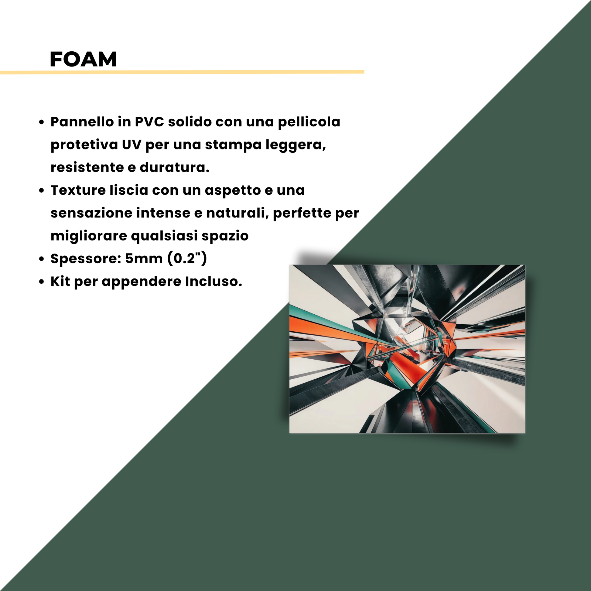Un’esplosione di forme geometriche e colori decisi definisce questa opera astratta, che richiama architetture avveniristiche. L’alternanza di nero, bianco, arancione e verde crea profondità e movimento, producendo un effetto tridimensionale che cattura subito l’attenzione. Ideale per ambienti tecnologici, uffici e spazi creativi, trasmette una sensazione di innovazione e modernità.