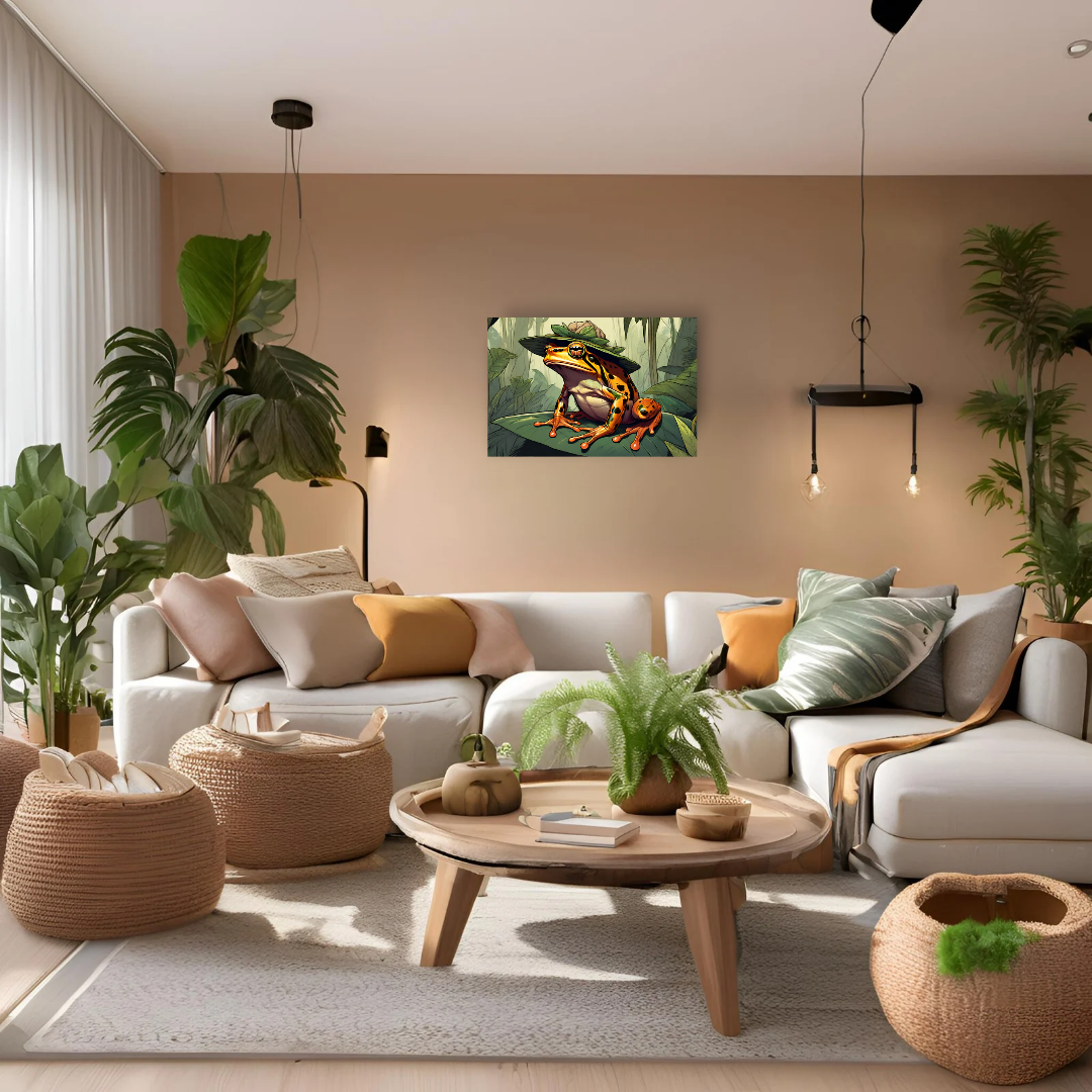 Il verde vibrante della vegetazione e la vivacità della rana contrastano con il cappellino da esploratore, creando una scena che è allo stesso tempo divertente e avventurosa. La rana, con i suoi occhi grandi e curiosi, sembra pronta a intraprendere una nuova scoperta, infondendo un senso di meraviglia e leggerezza.