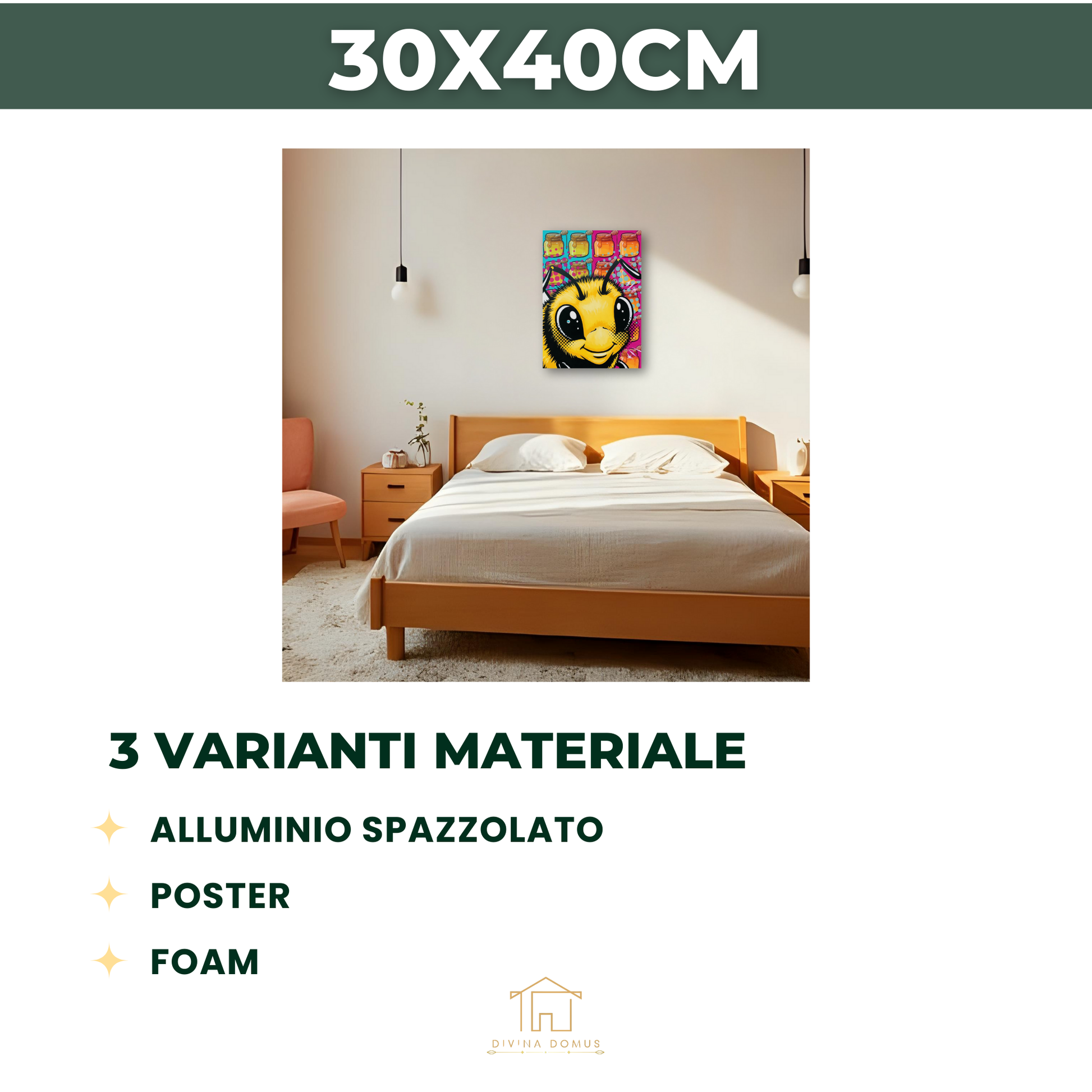 Un’esplosione di energia pop e colore: questa opera presenta un’ape stilizzata dal grande impatto visivo, caratterizzata da occhi espressivi e sorriso accattivante, in perfetto stile cartoon. Sullo sfondo, una composizione di barattoli di miele su campiture vivaci turchesi e magenta aggiunge ritmo e dinamismo grazie a un gioco di pois colorati e dettagli brillanti dall’effetto pop art contemporaneo. Perfetto per chi ama arredare con brio e positività, questo quadro trasmette buonumore e vitalità in ogni ambiente, donando carattere con uno spirito allegro e moderno.