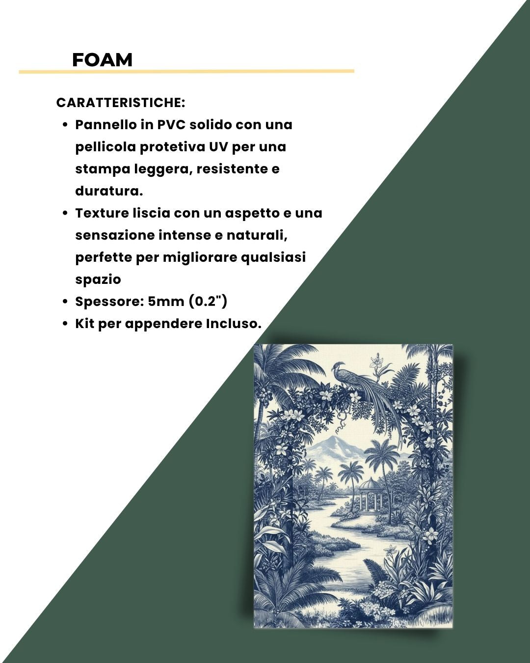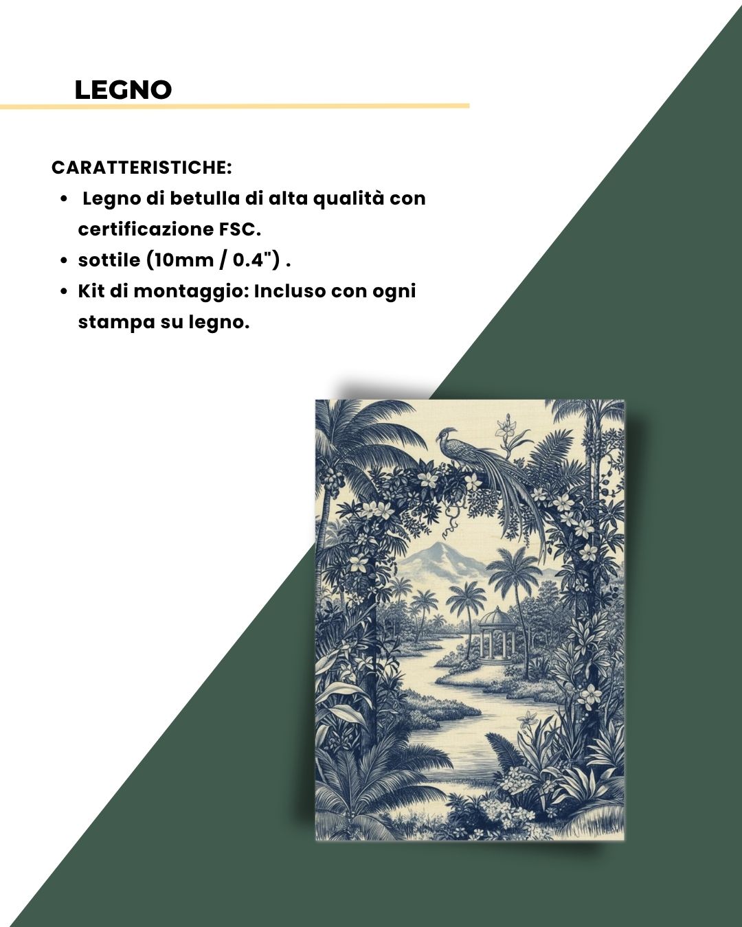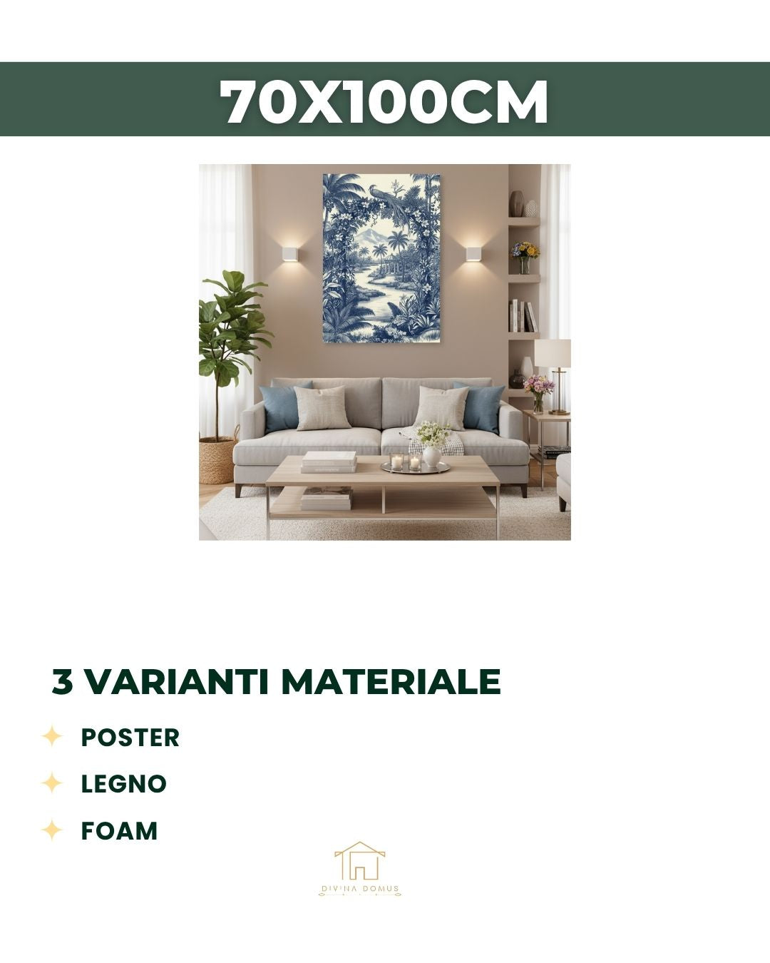 Un viaggio visivo tra eleganza e natura con “Paradiso Botanico Monocromo”. Questo quadro in stile toile de Jouy ti porta in un paesaggio tropicale incantato, dove palme, fiori e un raffinato uccello arricchiscono la scena. I toni blu donano freschezza e personalità, perfetti per chi ama il fascino vintage e un tocco tropical-chic sulle pareti di casa. Ideale per ambienti luminosi, spazi creativi e chi vuole sentirsi sempre in vacanza.