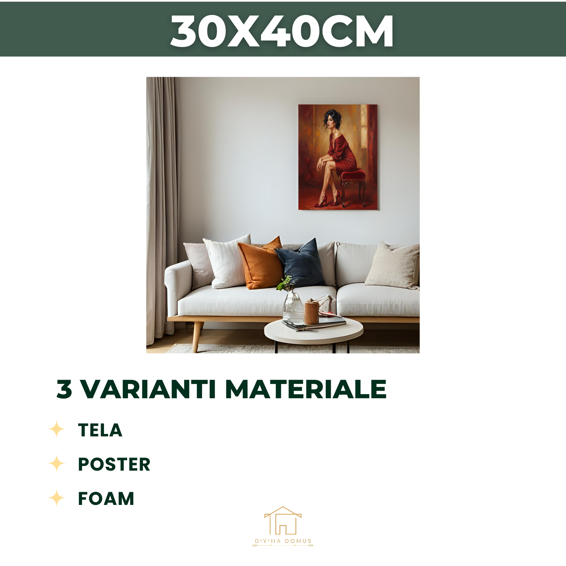 Un'opera che celebra la grazia e la femminilità attraverso pose delicate e una palette di rossi intensi. La figura, avvolta da un abito sofisticato e seduta su uno sgabello in velluto, trasmette sensualità e introspezione, incorniciata da luci soffuse che richiamano le ambientazioni dei salotti classici. Questo quadro rappresenta la bellezza discreta e l’armonia senza tempo, ideale per valorizzare spazi eleganti e donare un tocco di classe alle pareti di casa o ufficio.