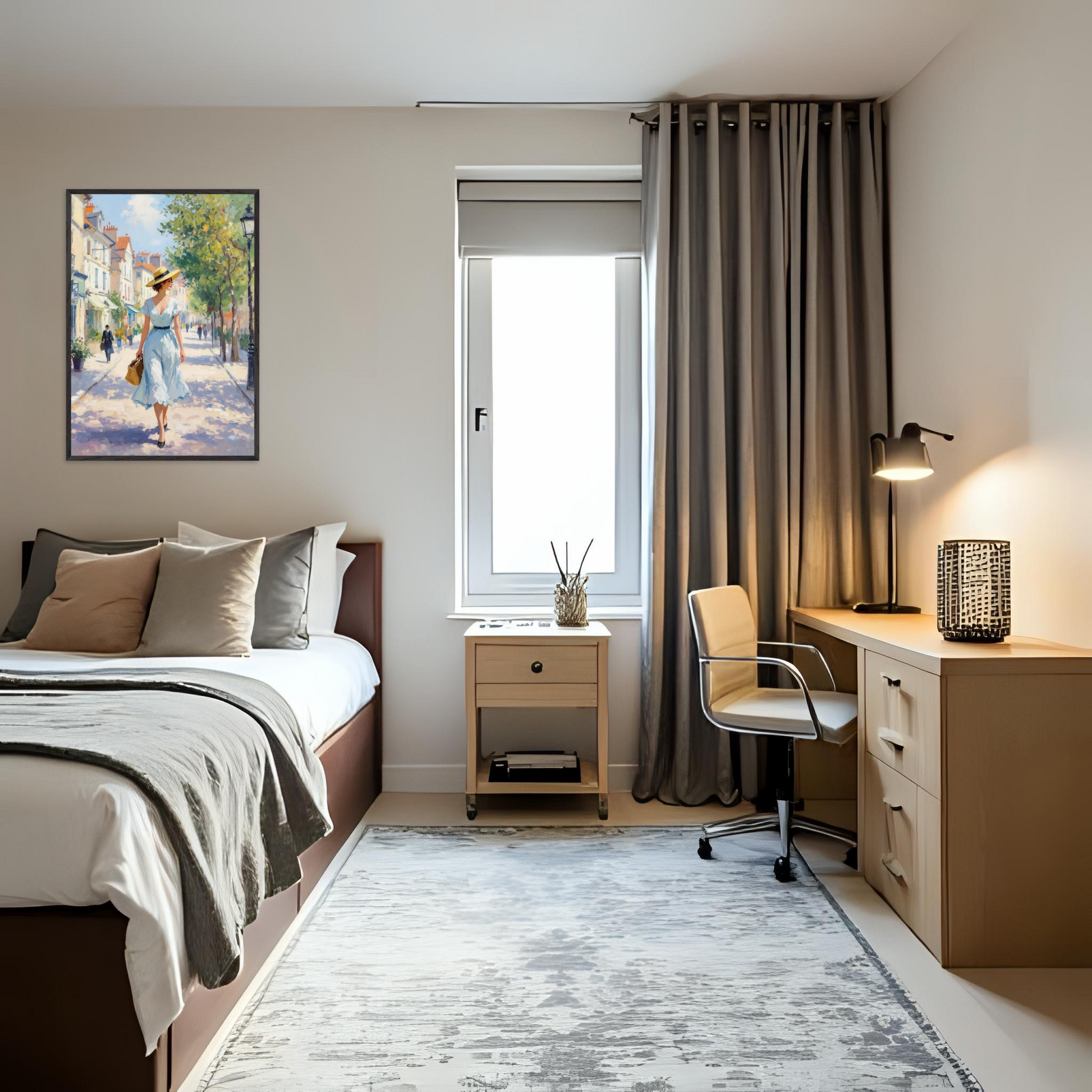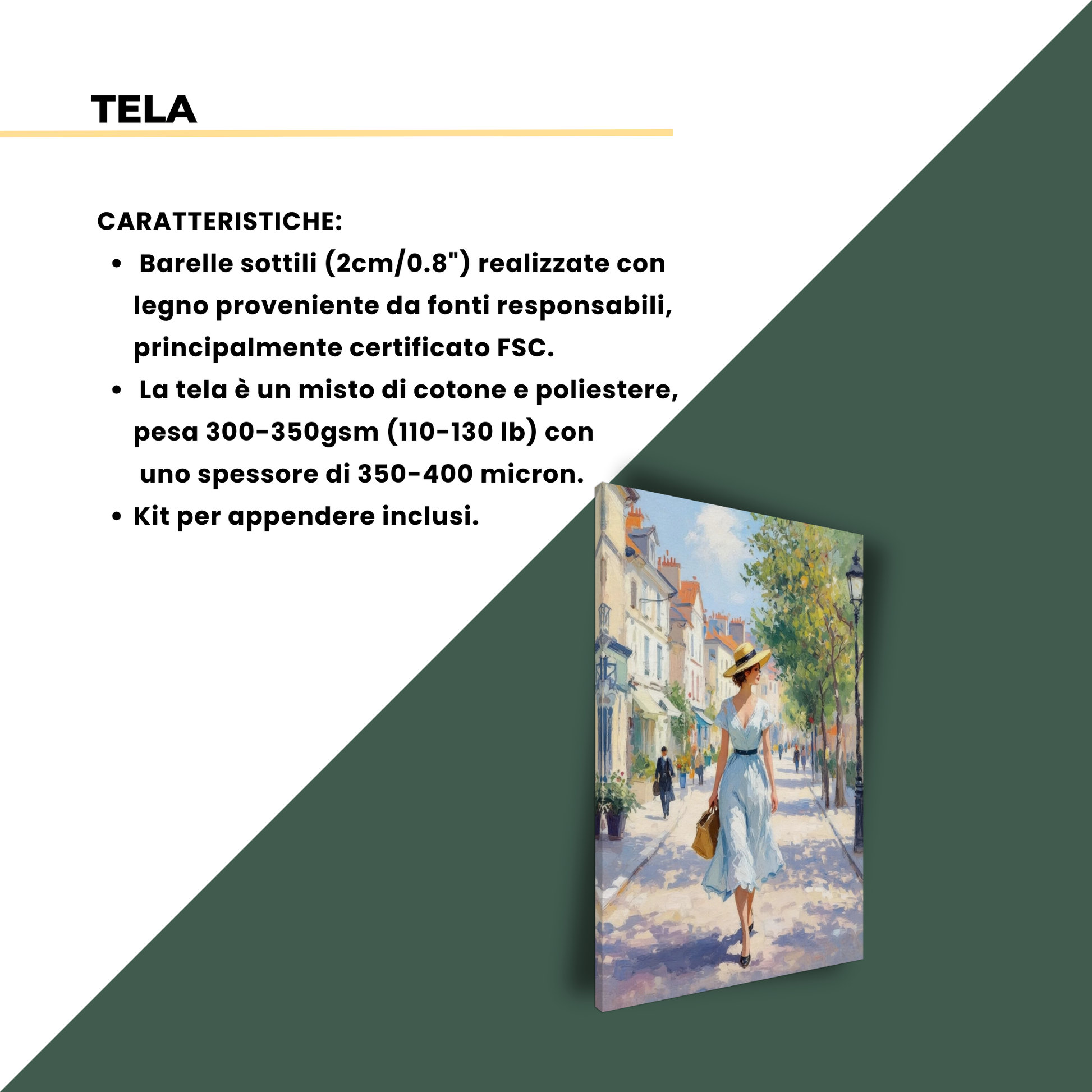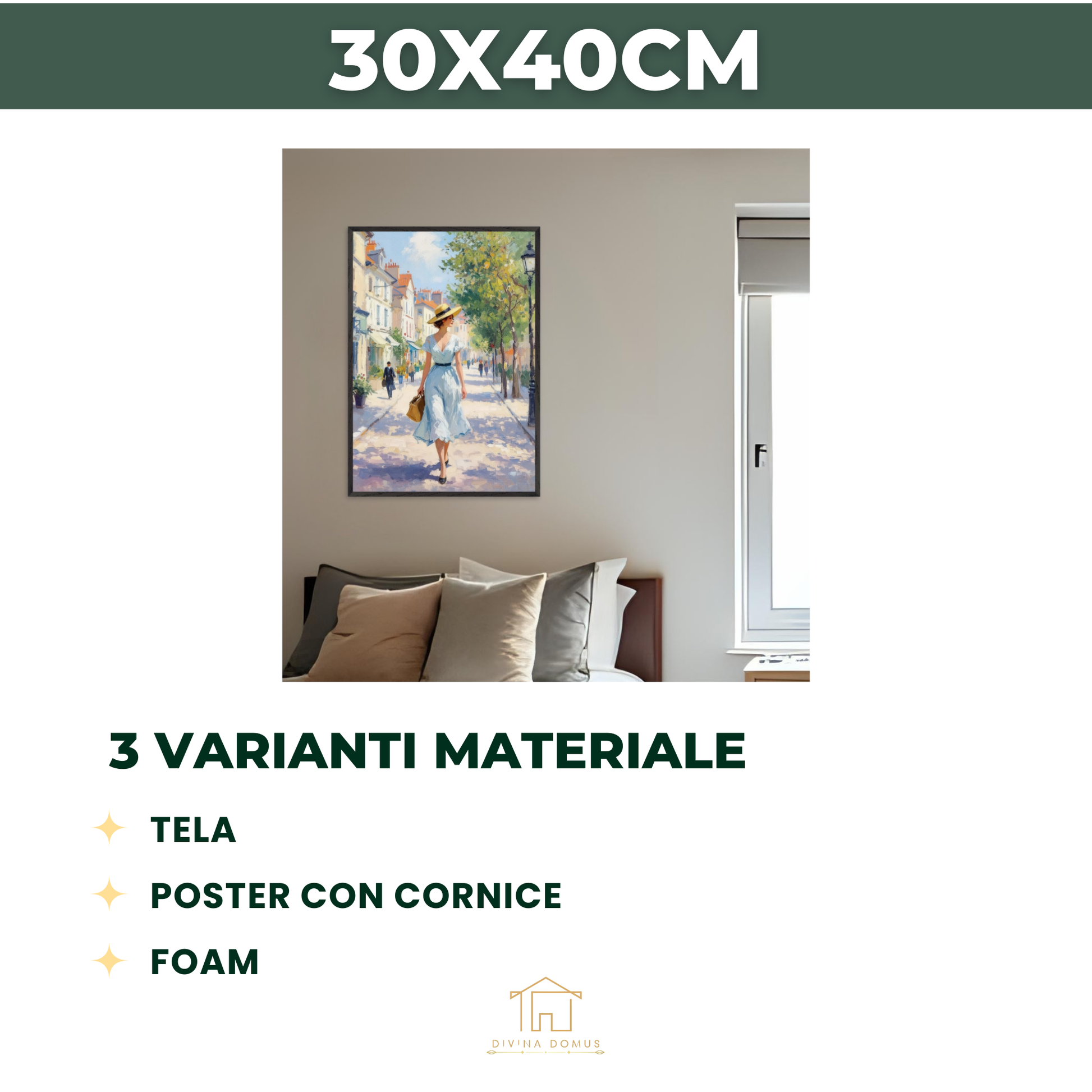 Immergiti nell’atmosfera incantevole di una città europea con “Passeggiata sui Boulevards”. Quest’opera in stile impressionista cattura la leggerezza e l’eleganza di una giovane donna vestita in abito chiaro, che cammina con grazia lungo una strada alberata, sotto la luce calda di un mattino estivo. Le pennellate vivaci e i colori pastello evocano momenti di serenità quotidiana, trasportando l’osservatore in una scena romantica, piena di charme e vitalità. Perfetto per chi desidera arredare la propria casa con un tocco di sofisticata bellezza, evocando sogni parigini e atmosfere da romanzo.