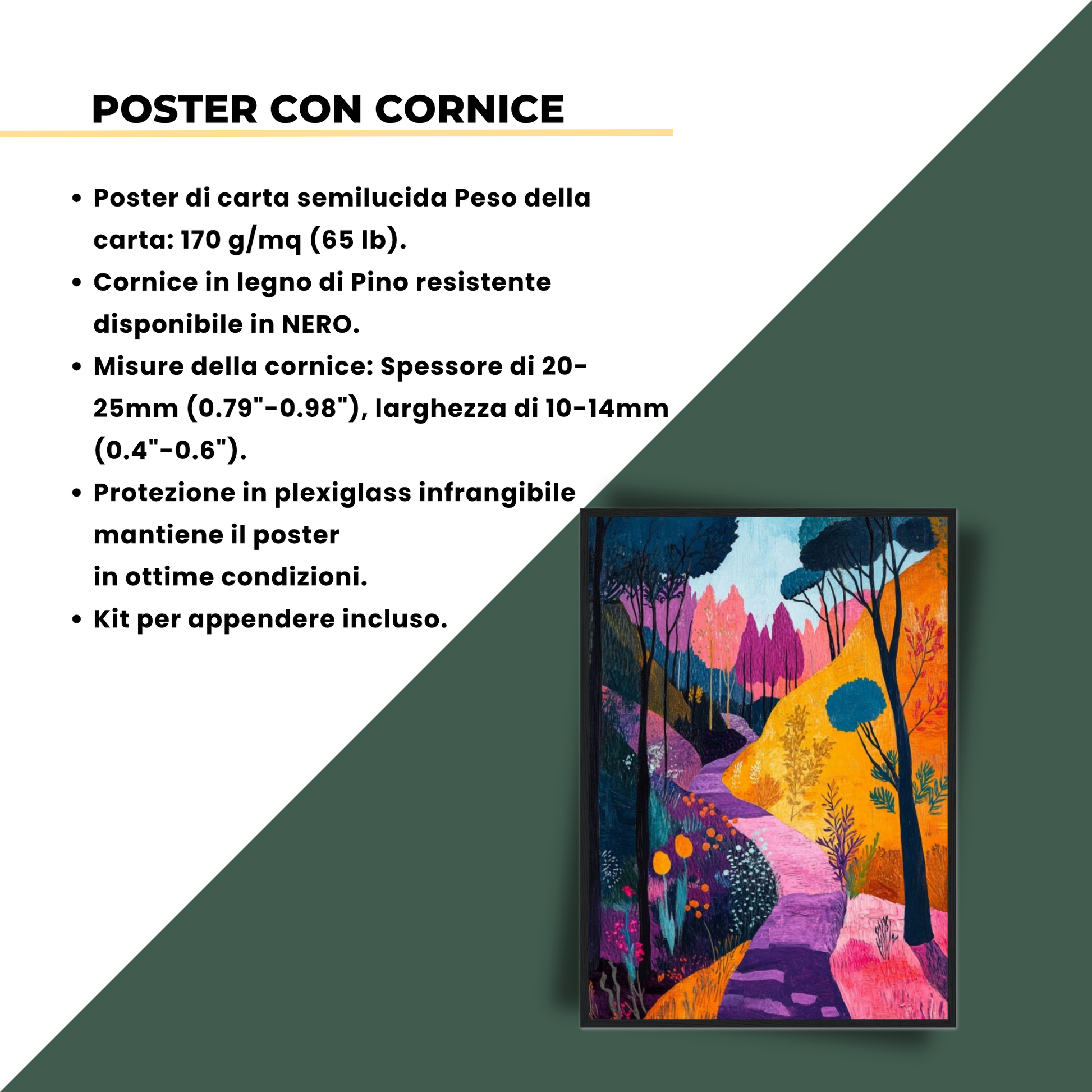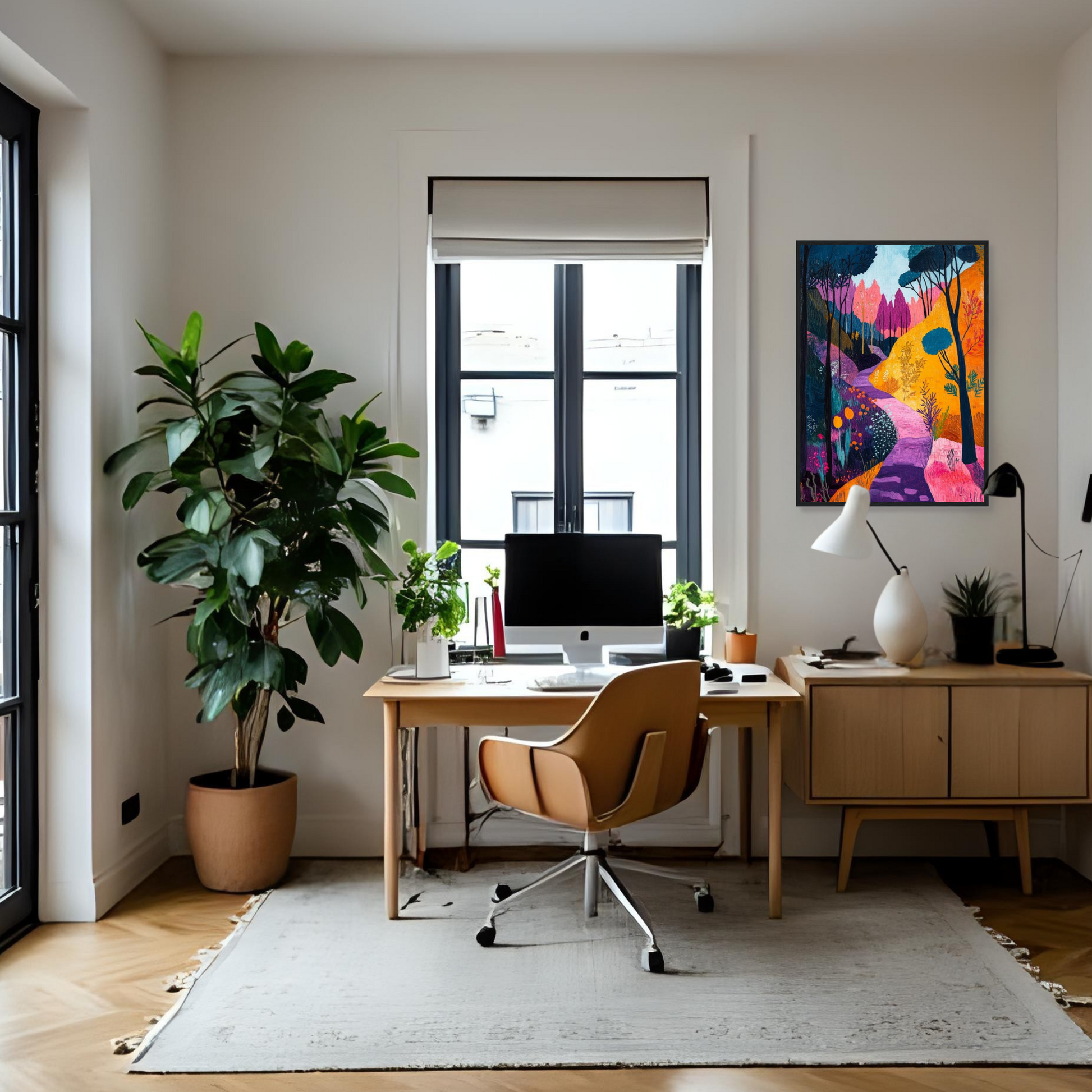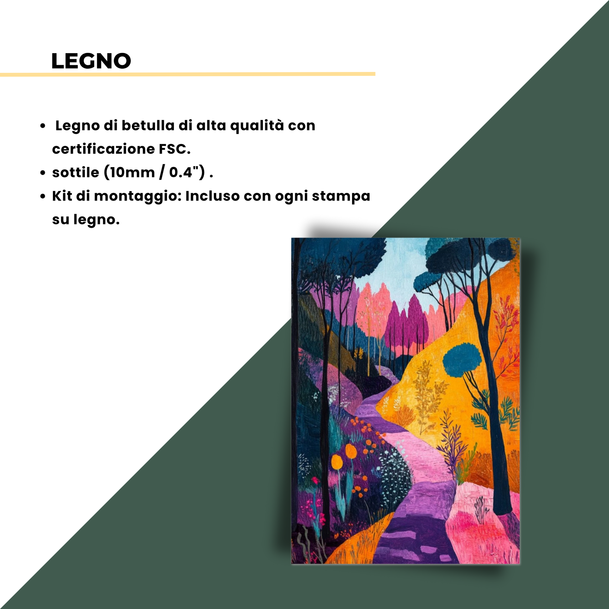 Il quadro raffigura un bosco fiabesco dove un sentiero sinuoso si snoda tra colori vivaci e accesi, con alberi dalle chiome in blu profondo, colline in giallo oro e vegetazione in sfumature di viola, rosa e arancio. Ogni elemento del paesaggio trasmette serenità ed energia positiva, invitando lo spettatore a immergersi in un’atmosfera di sogno e tranquillità. Ideale per amplificare la sensazione di relax in qualsiasi ambiente, questo dipinto unisce uno stile moderno alla bellezza naturale.